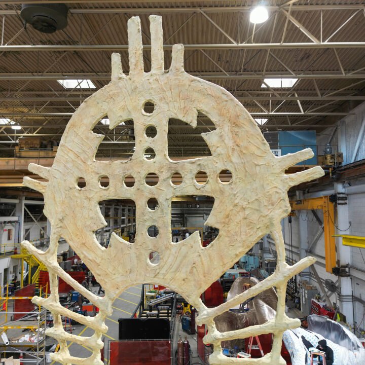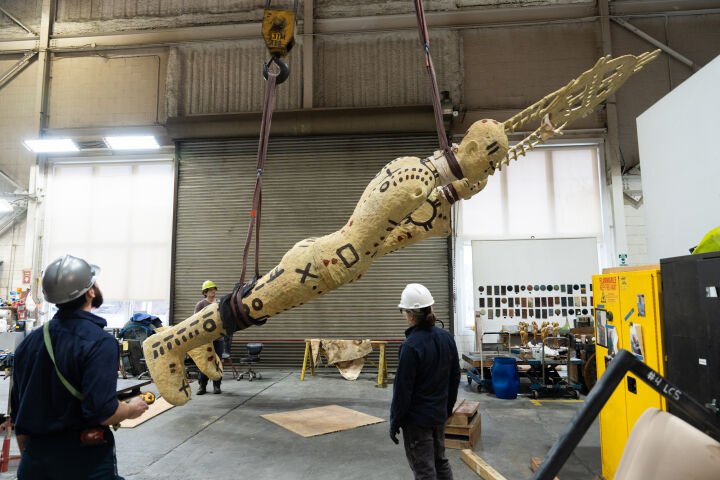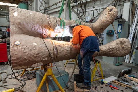 The 25-foot-tall, 3,380-pound sculpture was stood up to check the patina and finishing progress. The patina process not only protects the sculpture from environmental damage but also adds depth and complexity to its appearance.