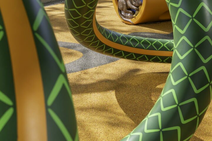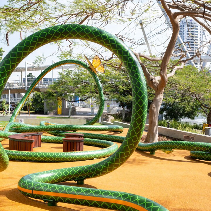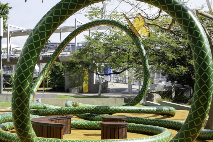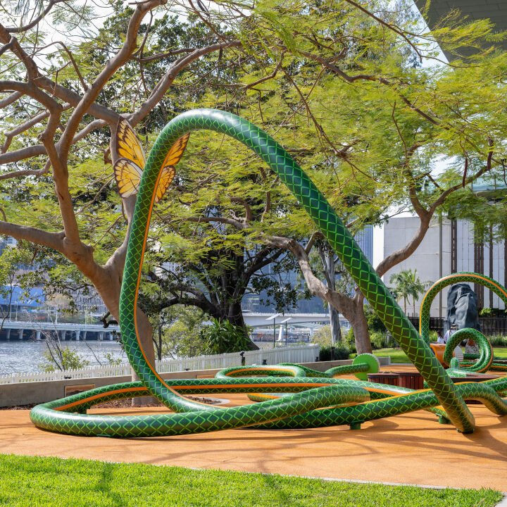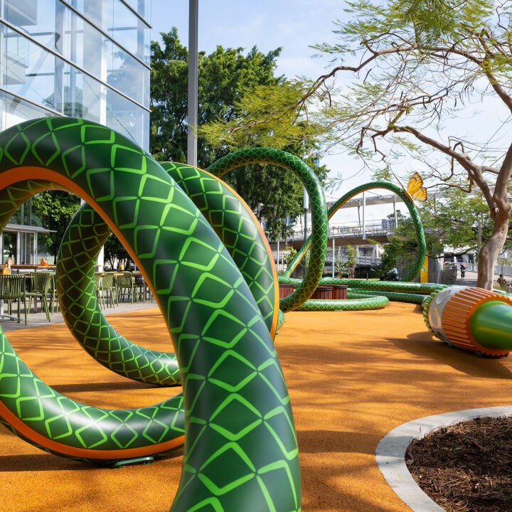 In a first for the Queensland Cultural Centre, an artist-designed play sculpture in the form of an oversized 119 metre-long garden hose has been unveiled outside Brisbane’s Gallery of Modern Art.