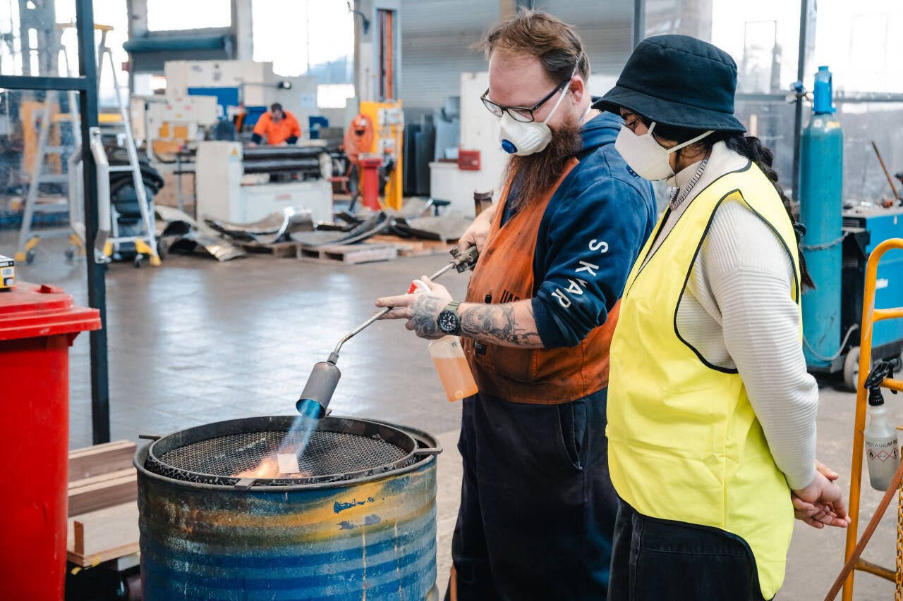 Shireen Taweel's artistic practice weaves together Islamic cultural practices, materiality, and sensory experiences, aiming to foster generative interactions with audiences. As her art moves into public spaces, Taweel emphasises the significance of language as a means to reclaim histories and challenge colonising narratives, drawing inspiration from traditional copper craftsmanship and learning about patina during her residency at our Brisbane foundry.