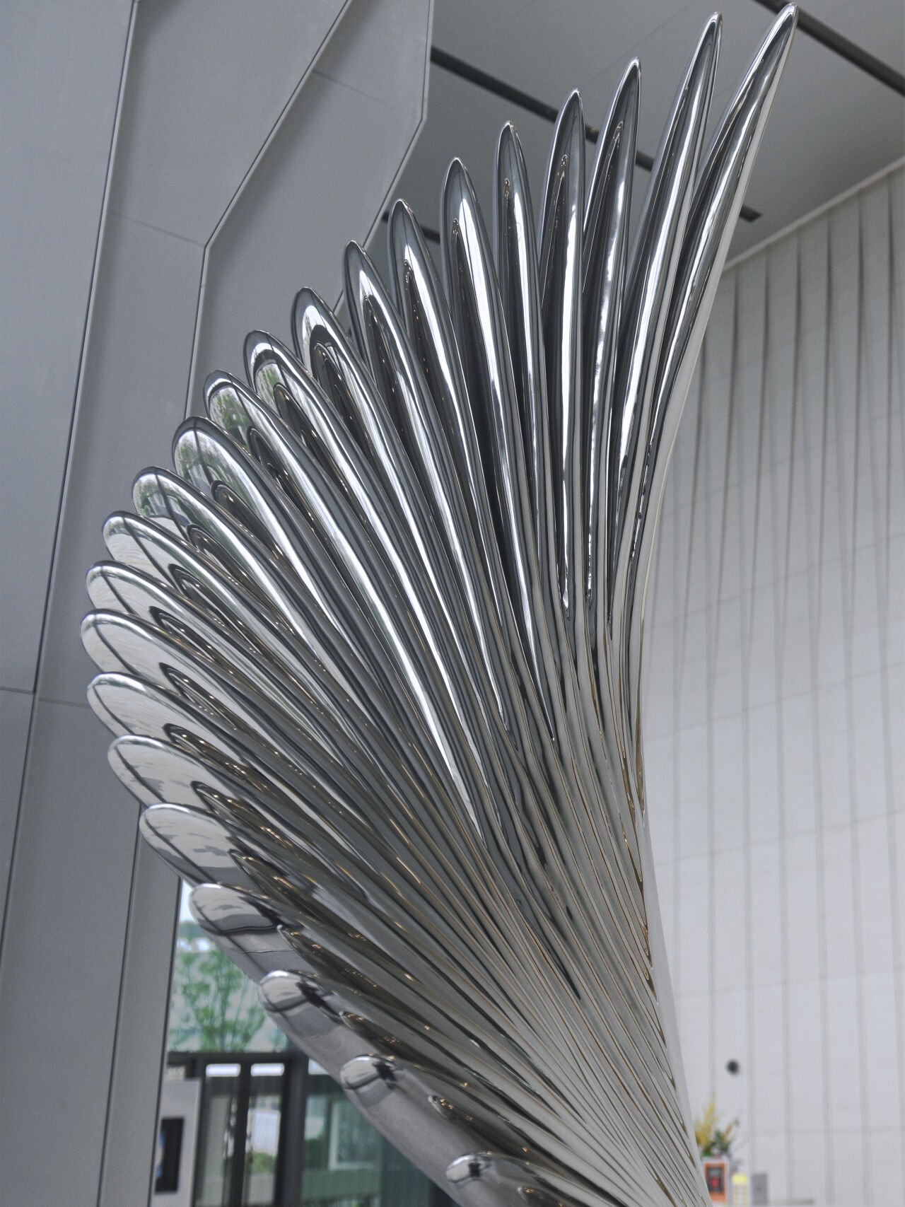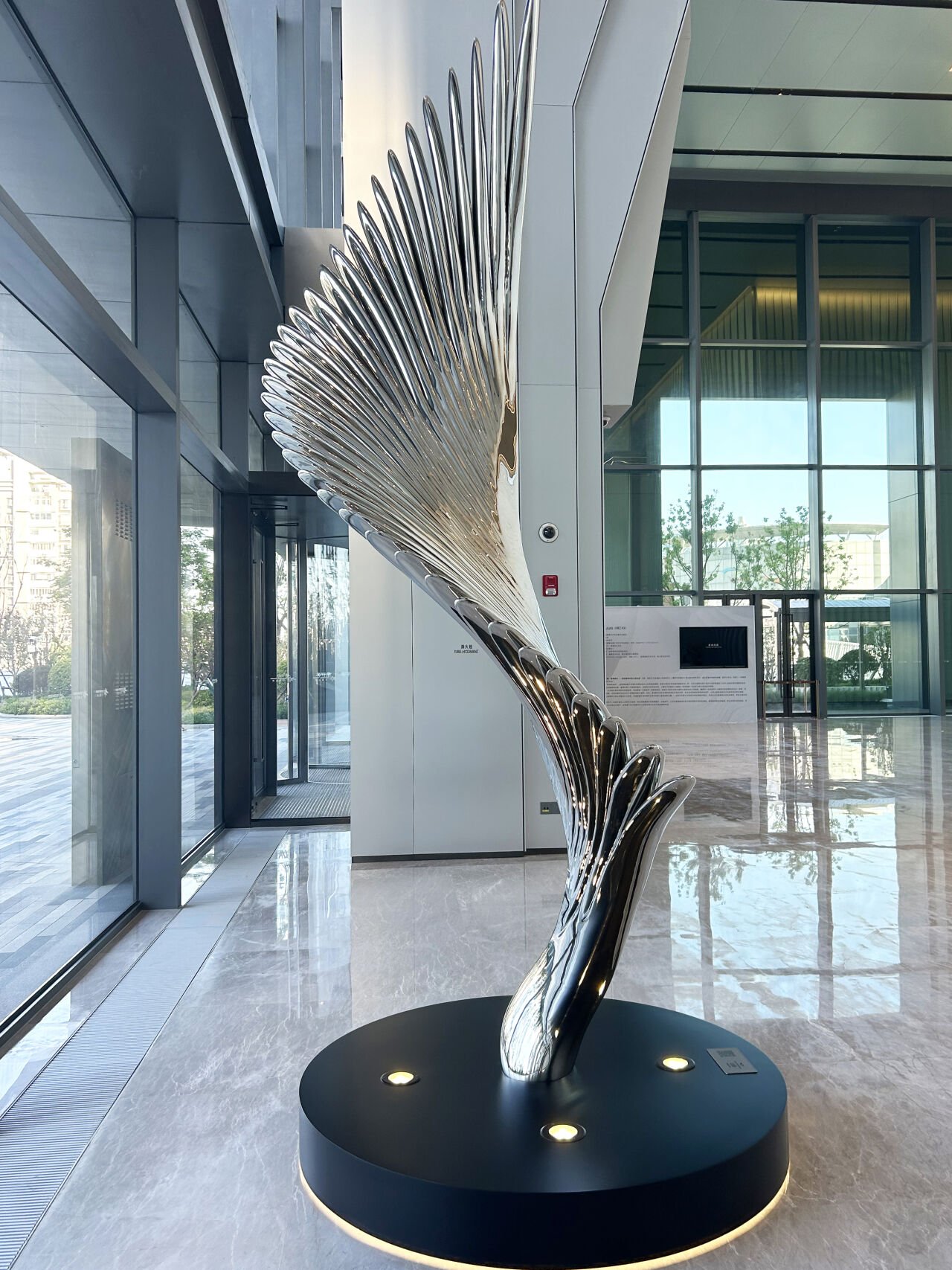 Structurally, the sculptures embody a balanced interplay of flow and strength, exuding remarkable dynamism. Positioned strategically in front of a transparent glass curtain wall, these pieces are illuminated by natural light, enhancing their visual impact. Through careful design elements such as spatial serialization and the innovative stainless steel forging technique, the artwork effectively blends with its surroundings. High-gloss mirror polishing adds an ethereal quality, rendering the sculptures translucent and creating a sense of suspension, as if they are “eternally rising.”