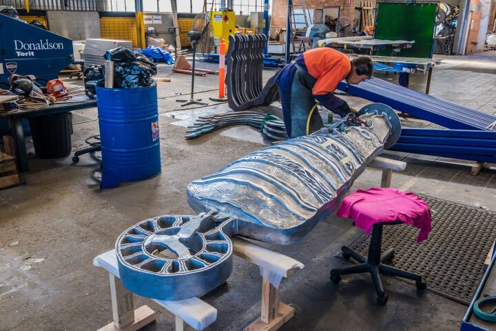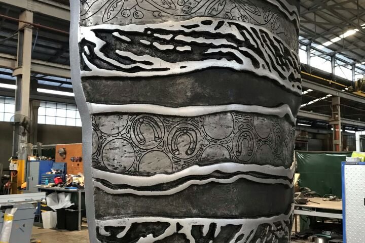 Our Brisbane team had the opportunity to collaborate with these artists and their vision to bring Baiame to life. They cast the piece in aluminium, sandblasted the concrete, and painted the intricate designs seen on the artwork.