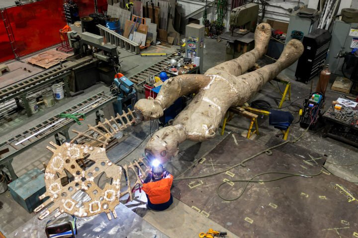 Beginning with a life-size clay original, the sculpture was scanned, and its intricate details were refined by a design team. This careful attention ensured that every nuance was preserved during the casting process, culminating in a stunning bronze finish. The beads were cast separately to achieve the intended look. With a specially constructed travel frame for safe rigging and installation.
