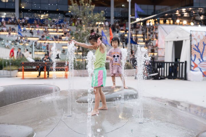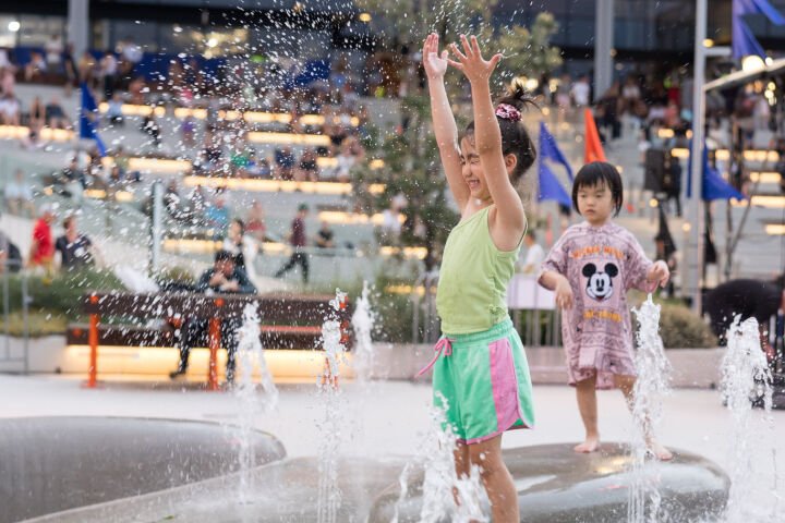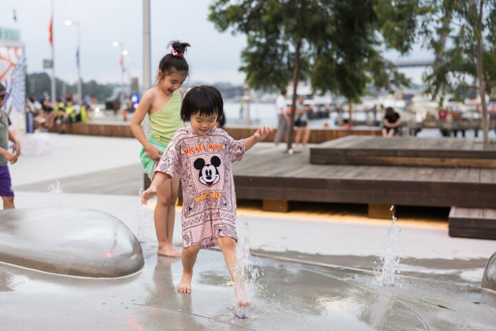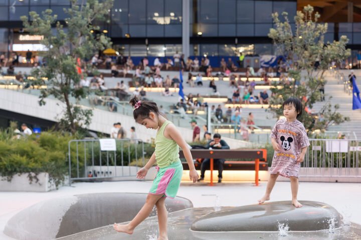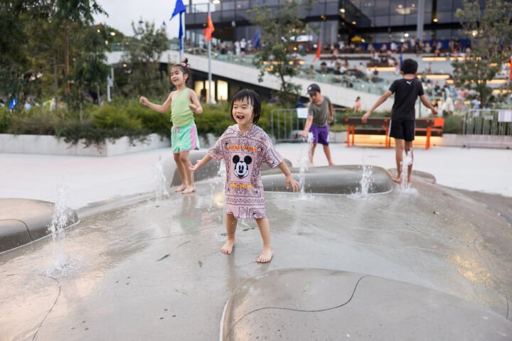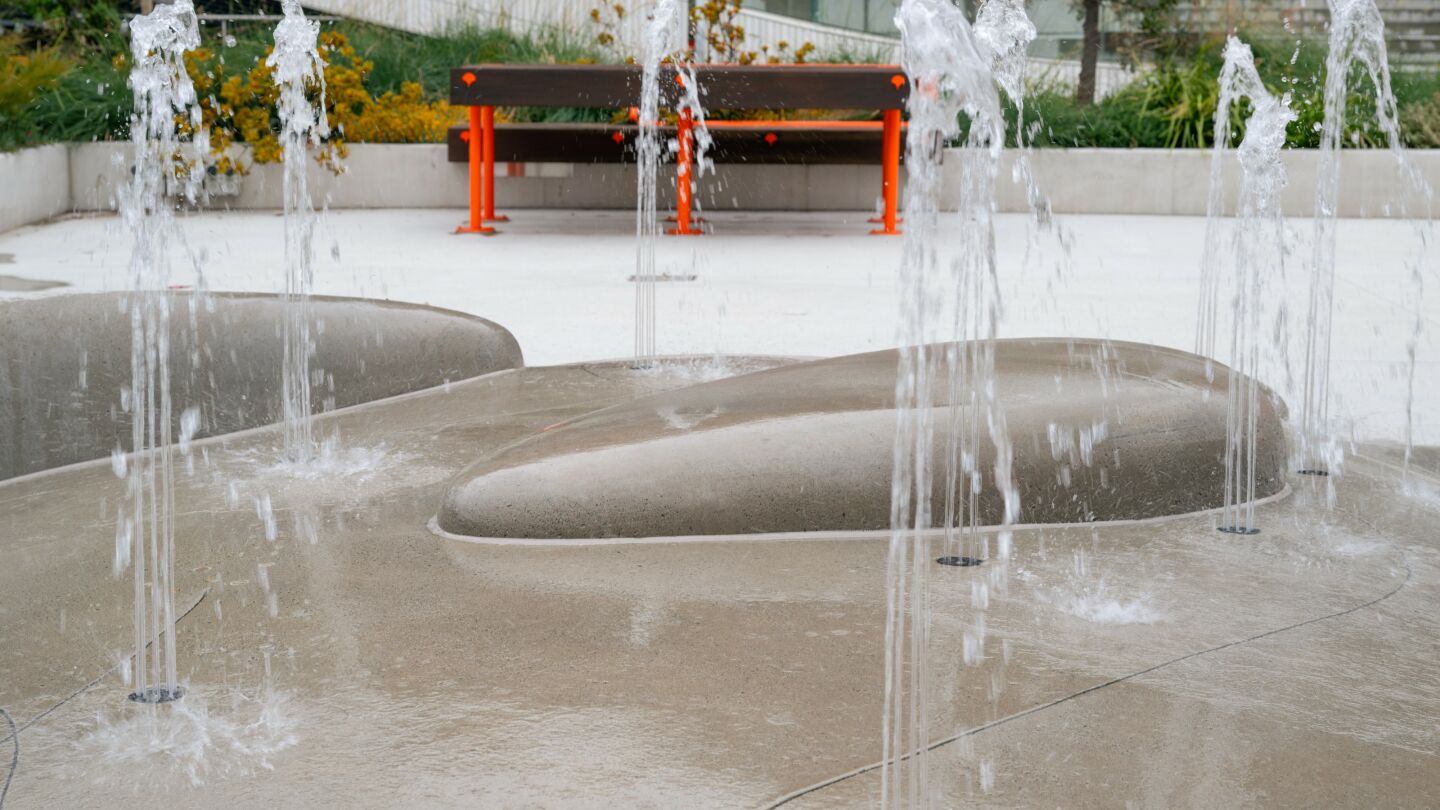 Page’s latest installation, ‘Land of the Giant Pippies’, is a waterplay installation that honours the significance of Sydney’s coasts. Tilt Industrial Design worked on the concept design with Page. It features a playful landscape composed of concrete mounds shaped like pippies, which are clams native to Australia, with inset bronze studs and etched lines representing the tracks of shellfish.