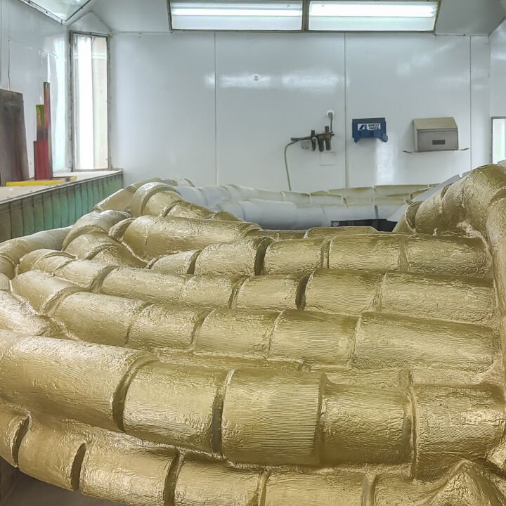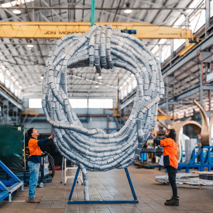 The artwork reimagines these cultural adornments symbolising Gadigal cultural resilience and ecological connection to this place. Four sculptural necklaces are fabricated from painted cast aluminium. The accompanying circular bronze plaques include a formal acknowledgment of Country and details of the significance of the Gadi Necklaces. The plaques also include a Gadi reed necklace which invites curious observers to touch.